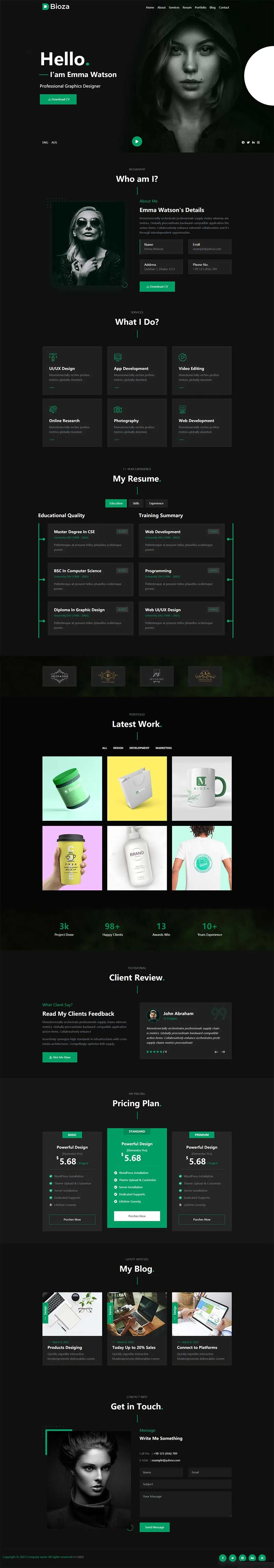这是一套黑色图形设计师个人简历HTML模板,同样适用于前端设计师个人简历网页模板,是专门展示个人简历的HTML模板。以黑色为主色调,给人一种专业、时尚的感觉。该模板提供了简洁、清晰的页面布局,包括个人介绍、作品展示、技能专长、教育经历等。通过使用这个模板,图形设计师可以快速创建一个独特而有吸引力的个人简历网站,展示自己的设计作品和专业能力,吸引更多的雇主和机会。